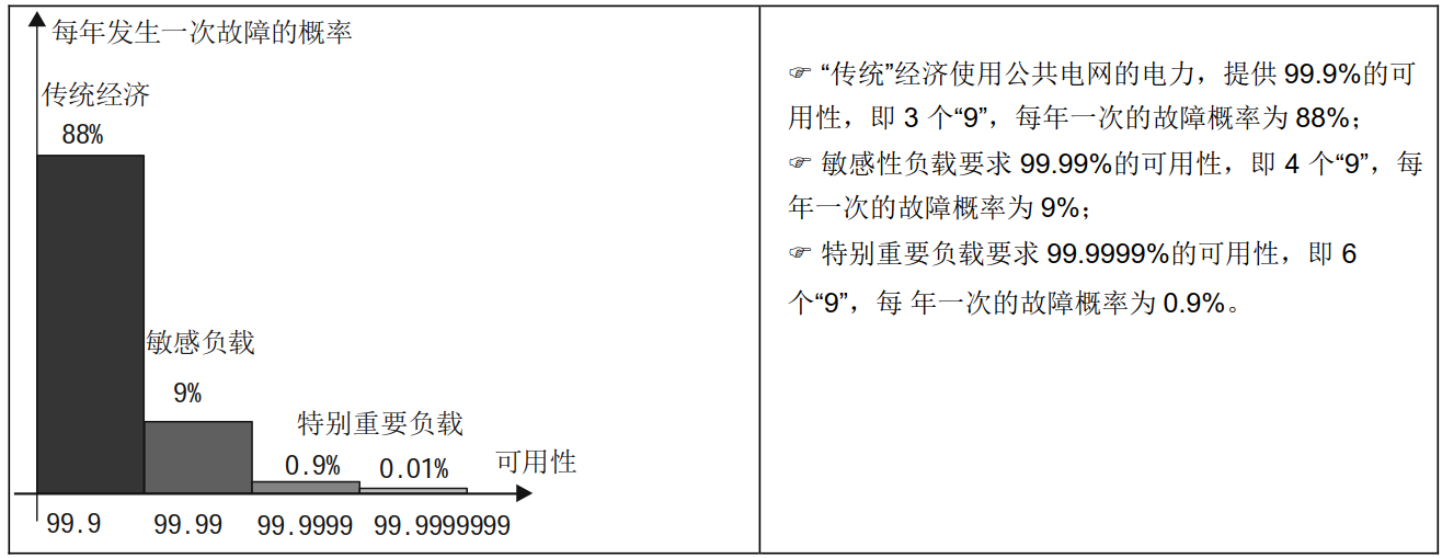 目前,我國的配電系統平均可靠性為4個9,即全年平均停電時間為1小時,而各工業生產中的一些一類和二類負載要求的供電可靠性為9個9,即平均 停電時間小于30mS;供電可靠性要求高于實際配電可靠性的這類負載生產制造業基本都存在。